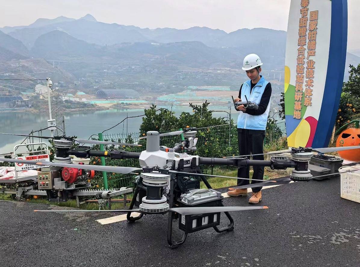 在奉节县永乐镇,工作人员正在调试无人机。(雷腾 摄)奉节的脐橙种植区大多分布于长江两岸的山地上。由于山高坡陡、道路崎岖,曾经脐橙运输只能靠肩挑手提,如何打通脐橙出山“第一公里”曾是困扰果农的难题。今年,奉节抓住低空经济发展机遇,将200多台无人机投入脐橙采收运输,破解脐橙产业运输环节困境,助力脐橙运输降本增效。